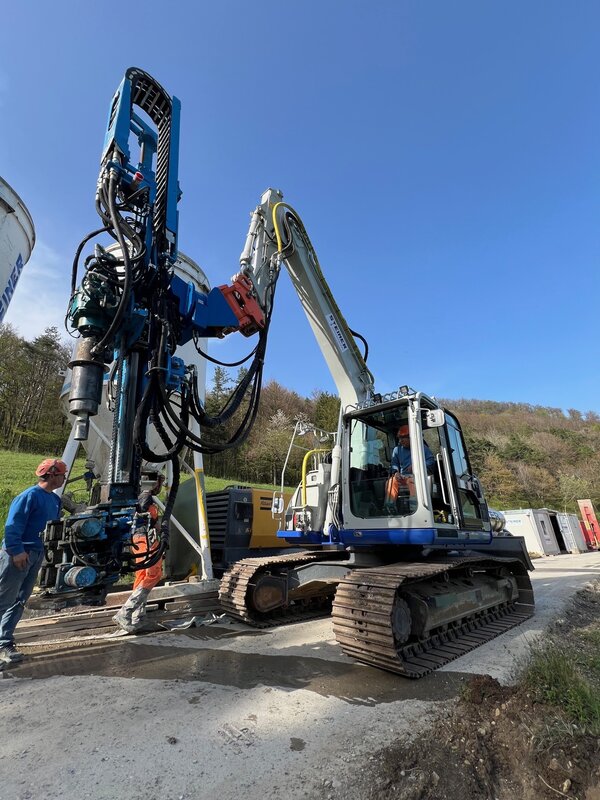 Mikropfähle Sanierung K474 Densbüren-Thalheim Baujahr: 2024 Ort: Densbüren/Thalheim Leistungsumfang: Erstellen von Zug- und Drucklanzen für die Stützmauer der neu erstellten Kantonsstrasse